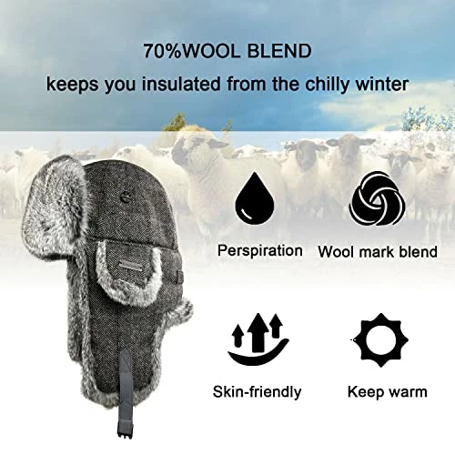 - High Quality Materials – Wool Blend Shell and Authentic 100% Real Rabbit Fur covers back of neck,ear flaps,and front flap.The high quality rabbit fur is super soft and fluffy and has strong heat retention,providing extremely toasty feeling for head,ears,face and neck ,whether youβre into cold weather sports, hunting, or just cruisinβdown your block