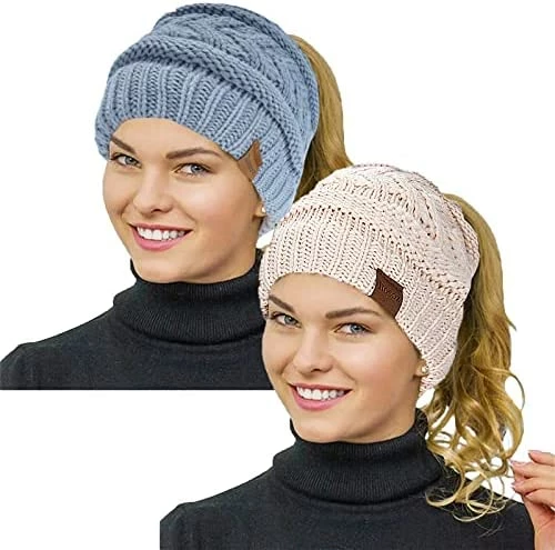 Best deal ๐ Rosoz 2 Pack Ponytail Beanie For ๐ฉ Women,Winter Warm Beanie Tail Soft Stretch Cable Knit Messy High Bun Hat Khaki/light Grey โจ